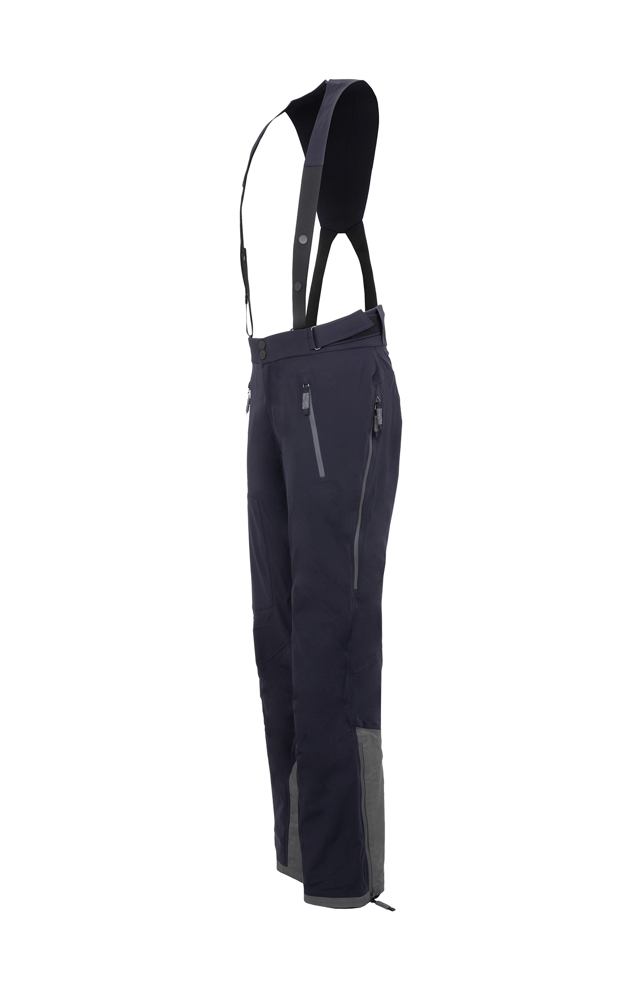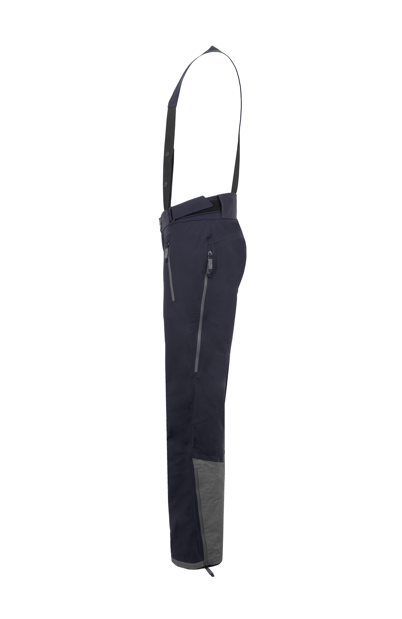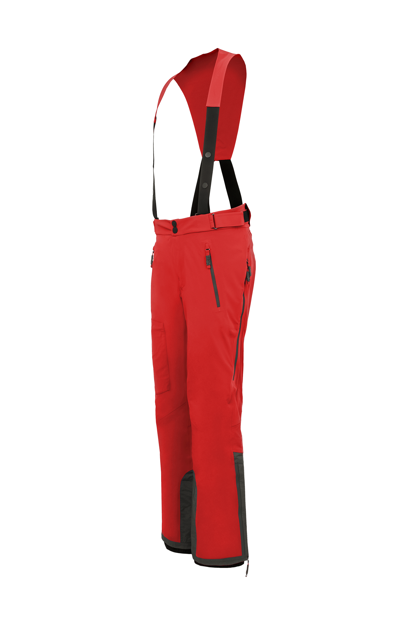 The durable outer surface is bonded with the technical membrane and lining. The seams are fully sealed for complete waterproof protection. The ski pants’ suspenders can be adjusted in width for a personalized fit. Comprehensive functionality is provided by the Alcantara leather edge protection, long zippers extending nearly to the knees, and snow gaiters with elastic cuffs. The upper section is cut slightly higher, reaching above the waist. The waistband can be individually adjusted with Velcro fasteners. Two asymmetrically placed buttons visually slim the waistline. When temperatures rise during a ski tour or after an intense run on the slopes, the rear leg zippers can be opened for extra ventilation.
