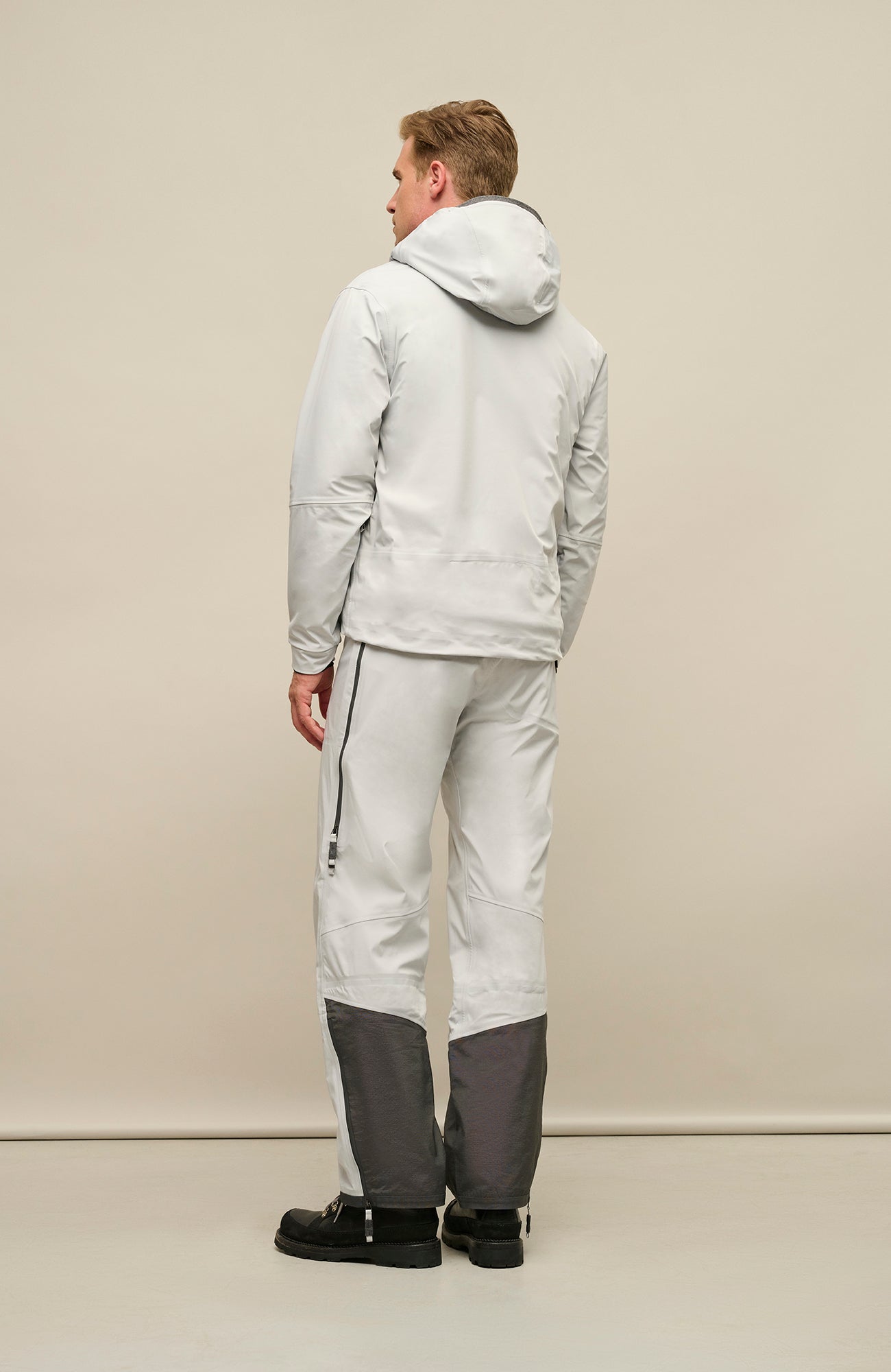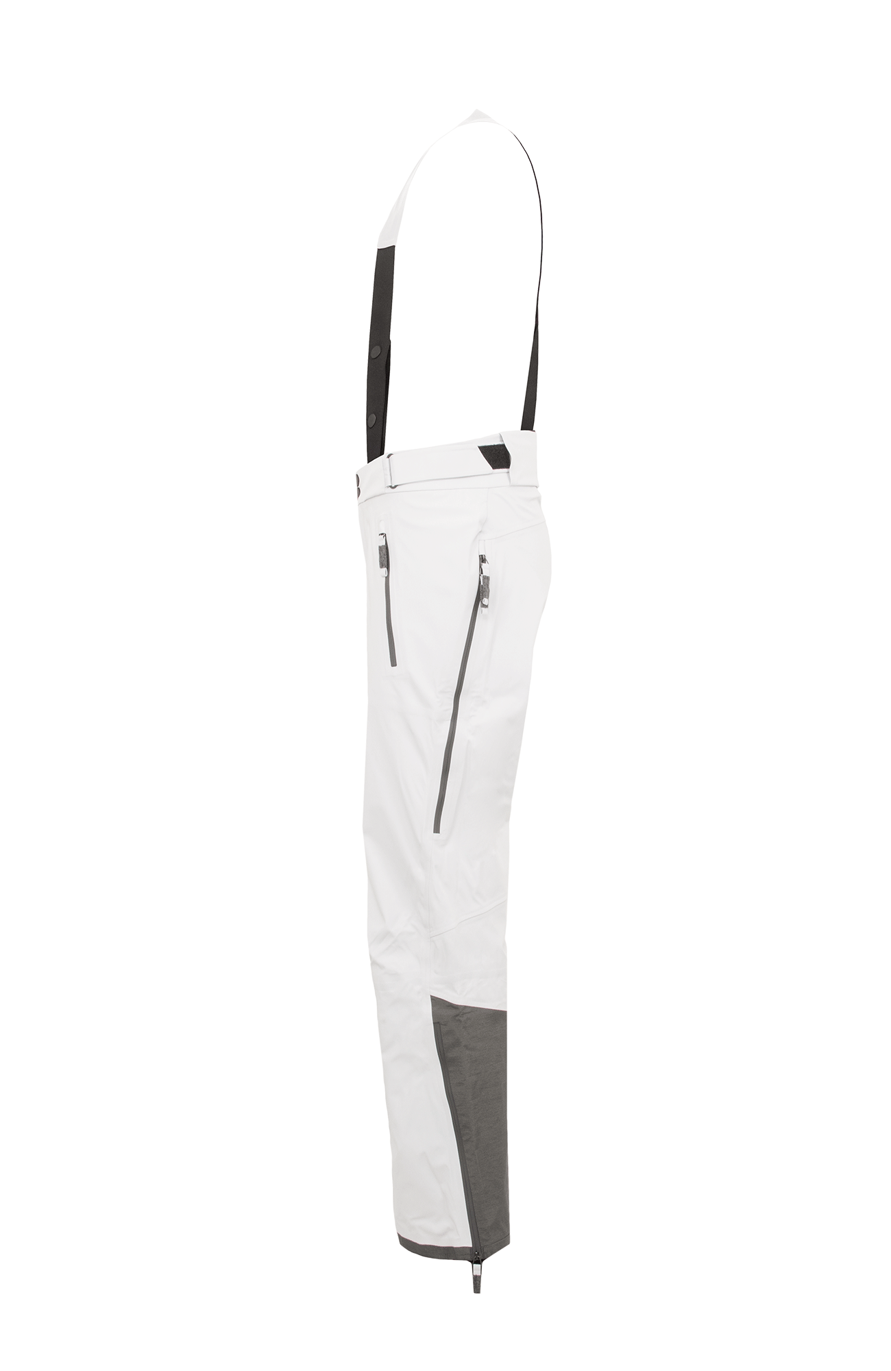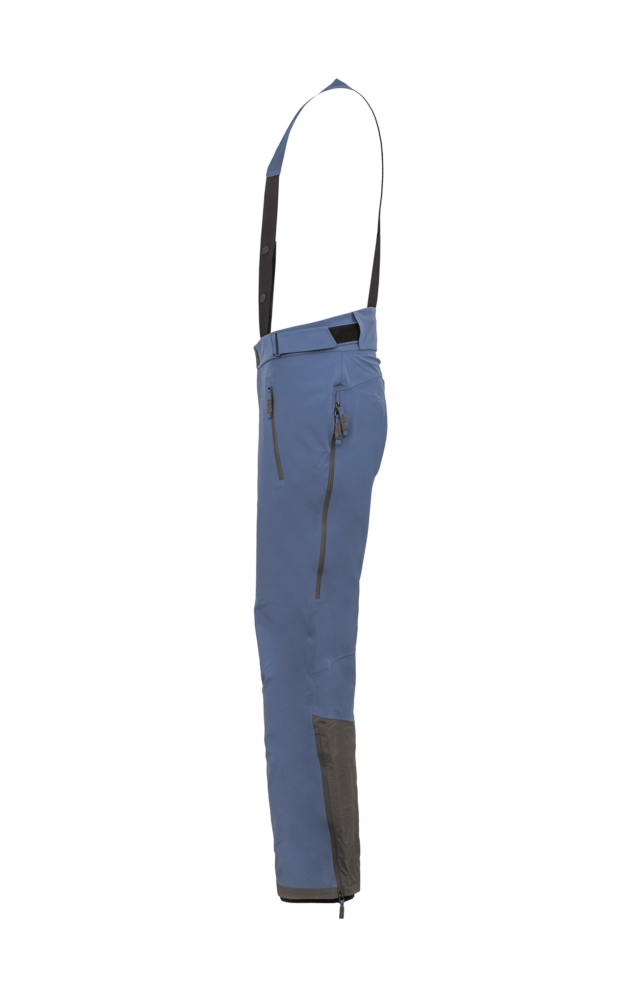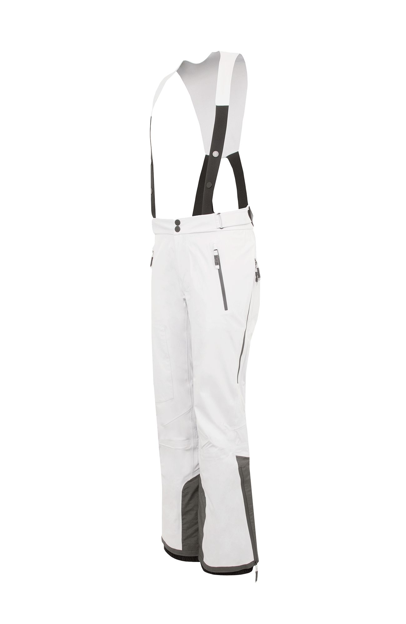 The durable outer surface is bonded with the technical membrane and lining. The seams are fully sealed for complete waterproof protection. The ski pants’ suspenders can be adjusted in width for a personalized fit. Comprehensive functionality is provided by the Alcantara leather edge protection, long zippers extending nearly to the knees, and snow gaiters with elastic cuffs. The upper section is cut slightly higher, reaching above the waist. The waistband can be individually adjusted with Velcro fasteners. Two asymmetrically placed buttons visually slim the waistline. When temperatures rise during a ski tour or after an intense run on the slopes, the rear leg zippers can be opened for extra ventilation.