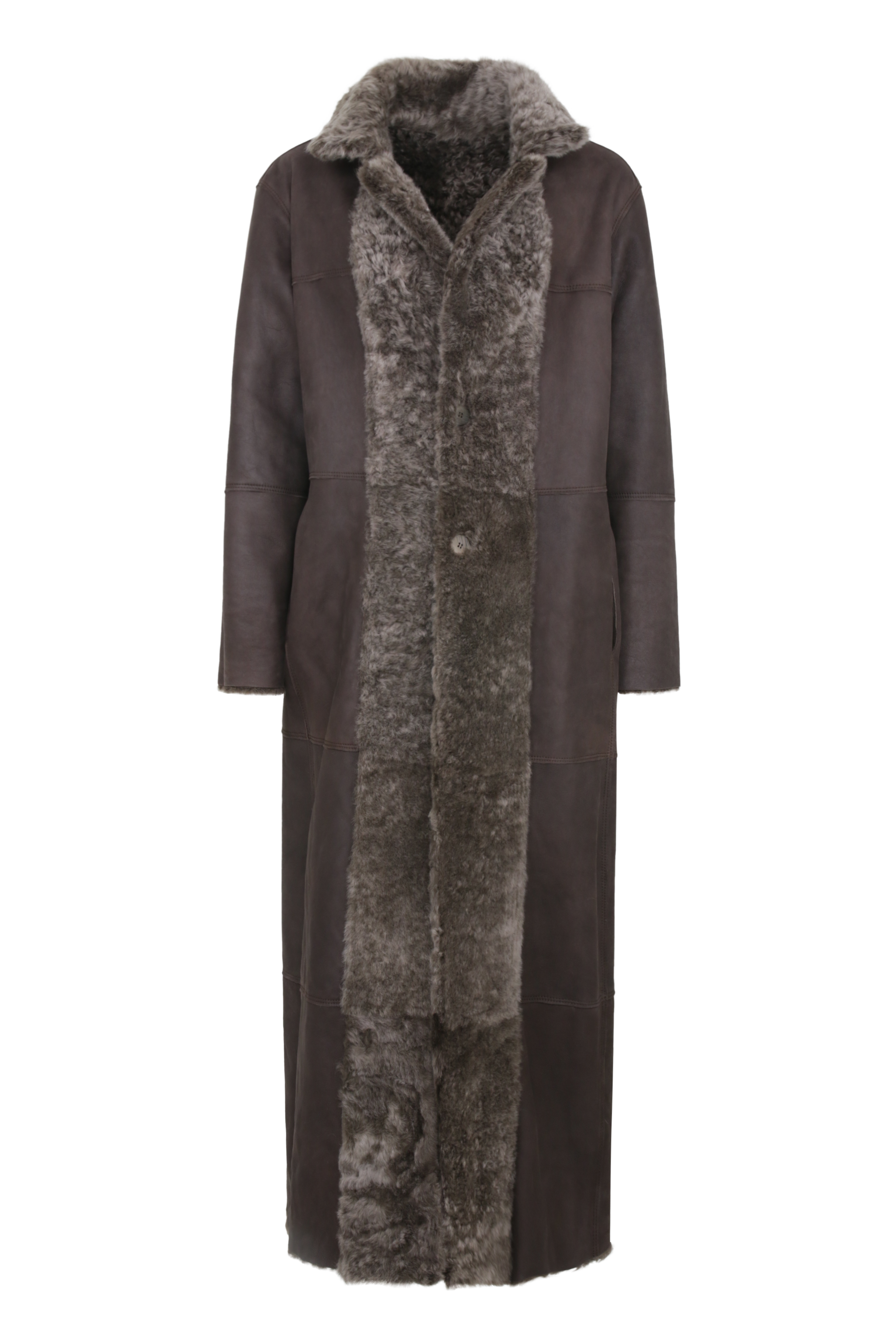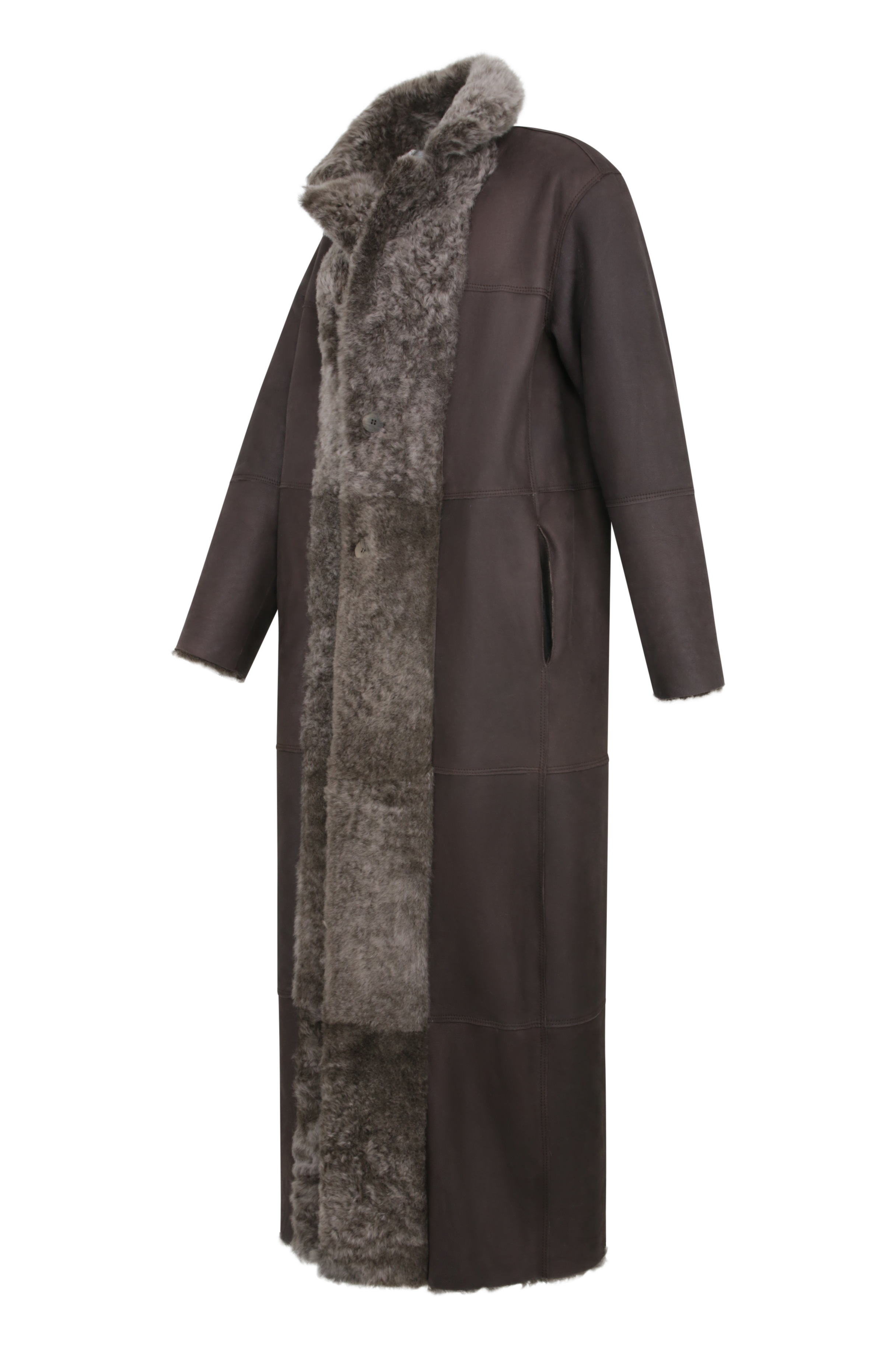 Shearling: A sumptuous, tactile shearling with a luminous, polished sheen. This side transforms the coat into a textured statement piece, equally suited for the crisp air of a mountain retreat or a night out in the city.