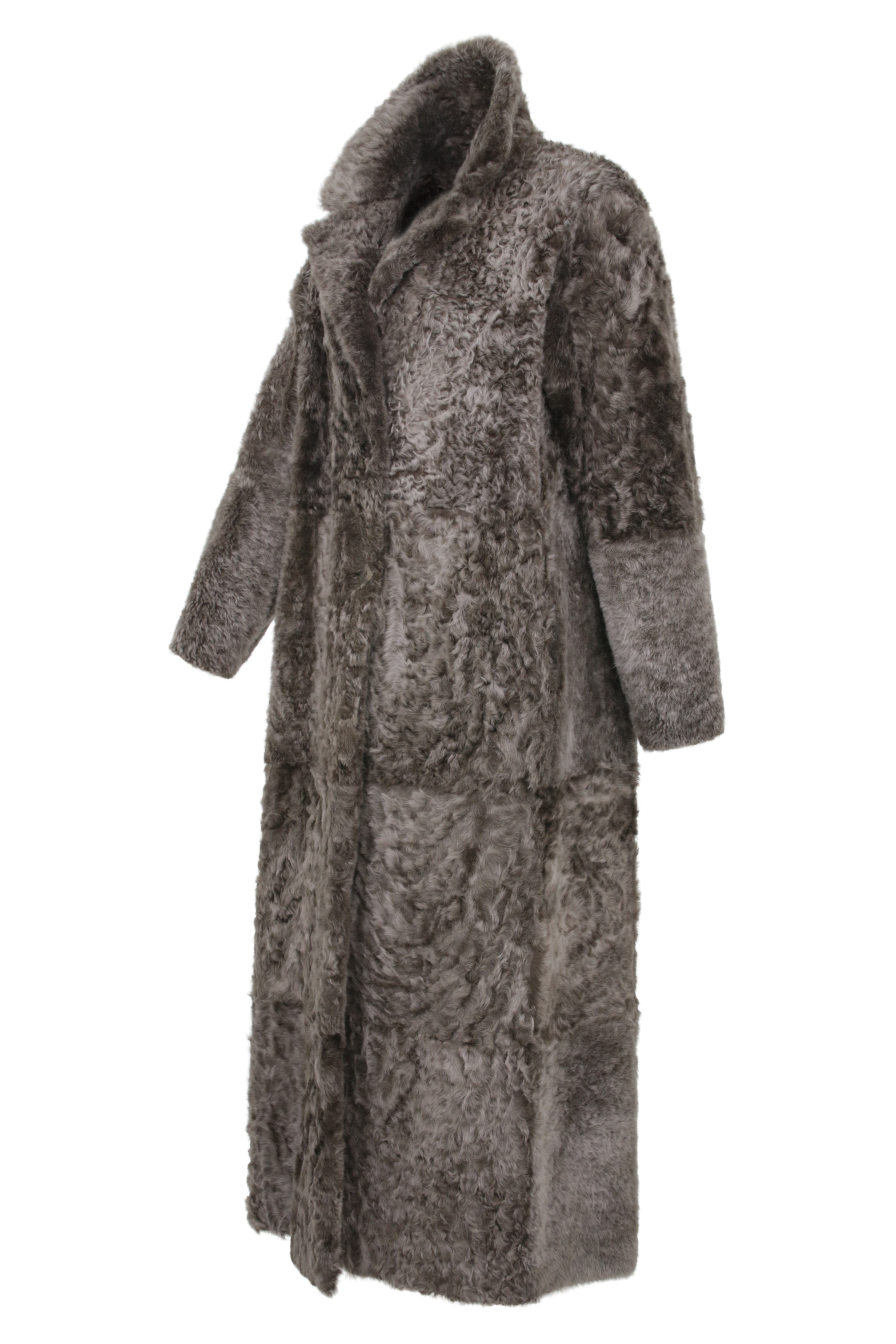 The coat is distinguished by its statement patchwork design, utilizing raw-edged seams to create a modern, graphic interplay of lines. This intentional arrangement serves as an expressive design detail, celebrating the natural beauty of the skins through a lens of contemporary artisanal craftsmanship.