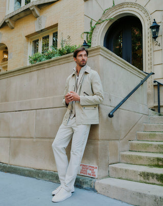 Lightweight outdoor jacket paired with the Oliver jacket and Eric pants in sandstone – a perfectly balanced look for stylish adventures.