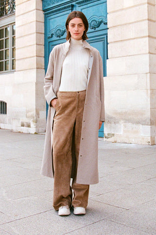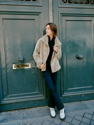 The short-cut Dolli shearling jacket paired with Christie softshell pants.